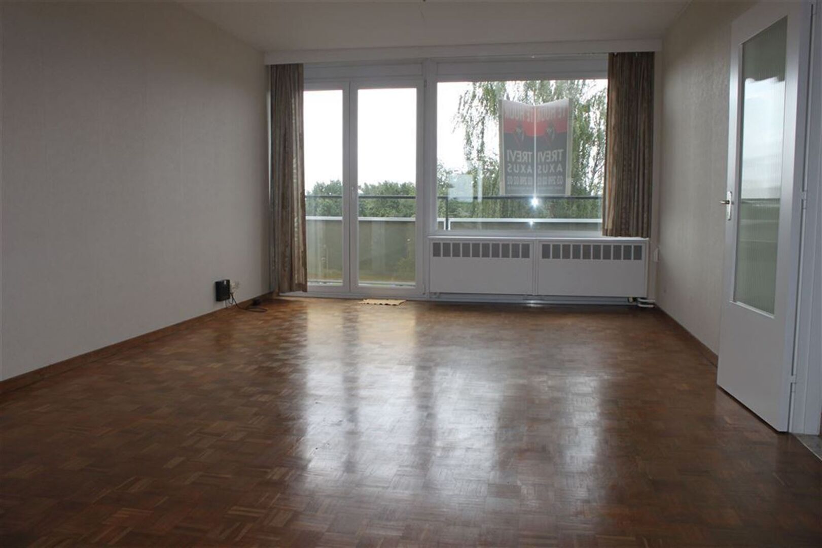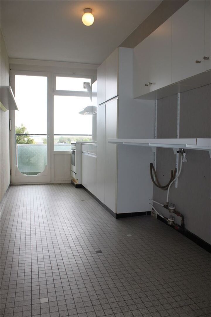 Ruime inkomhal / living met eetplaats (30m²) met toegang tot balkon / half-ingerichte keuken met toegang tot balkon / 3 slaapkamers (4,2 x 3,4m; 3,4 x 3,4m; 3,5 x 2m) / douchekamer met wastafel en douche.