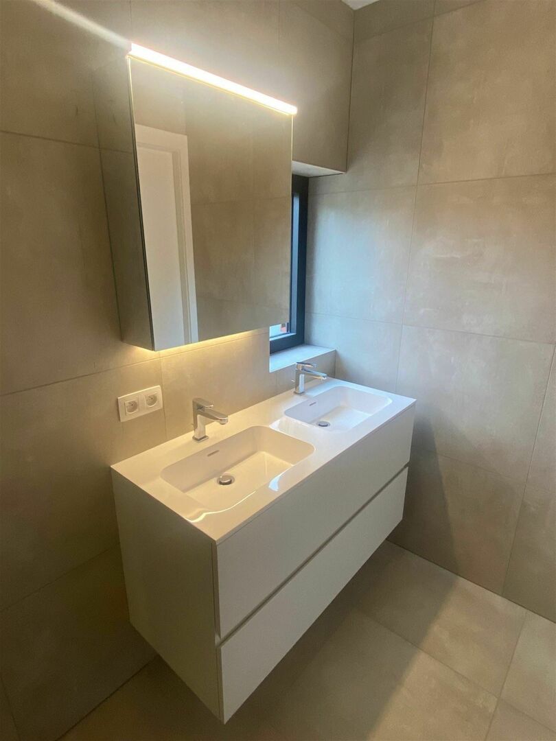 2de verdieping: Nachthal / wc / 2 slaapkamers (14m²; 7m²) / badkamer met dubbele wastafel en inloopdouche / berging met stookplaats.