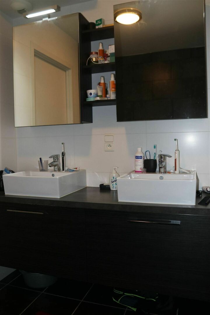 Inkomhal met vestiaire / wc met handwas / living met eetplaats (38m²) met super-ingerichte open keuken (8m²) en toegang tot terras (4,1 x 1,7m) / berging / nachthal / wc / 2 slaapkamers (4 x 3,6m; 3,6 x 3m) waarvan de grootste met toegang tot terras (7m²) en gemeenschappelijke tuin / badkamer (2,7 x 1,8m) met dubbele wastafel en ligbad / douchekamer (2,7 x 0,9m) met wasplaats.
