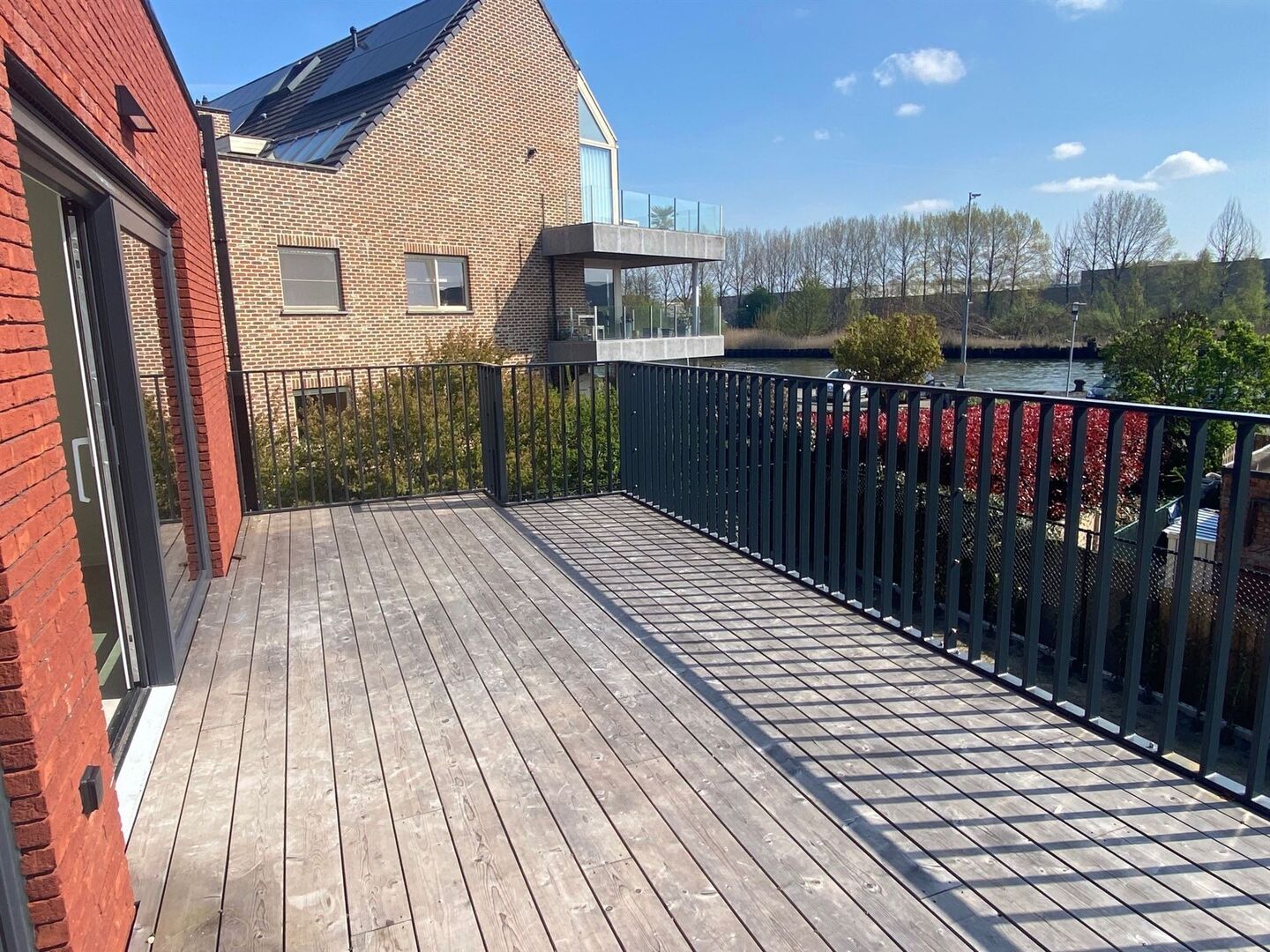 Inkomhal / wc met handwas / living met eetplaats en super-ingerichte open keuken (totale opp.: 39m²) met toegang tot groot terras (22m²) (met zicht op kanaal) / berging met was- en stookplaats / 2 slaapkamers (3,8 x 3,3m; 3,3 x 2,8m) / badkamer met dubbele wastafel en inloopdouche.