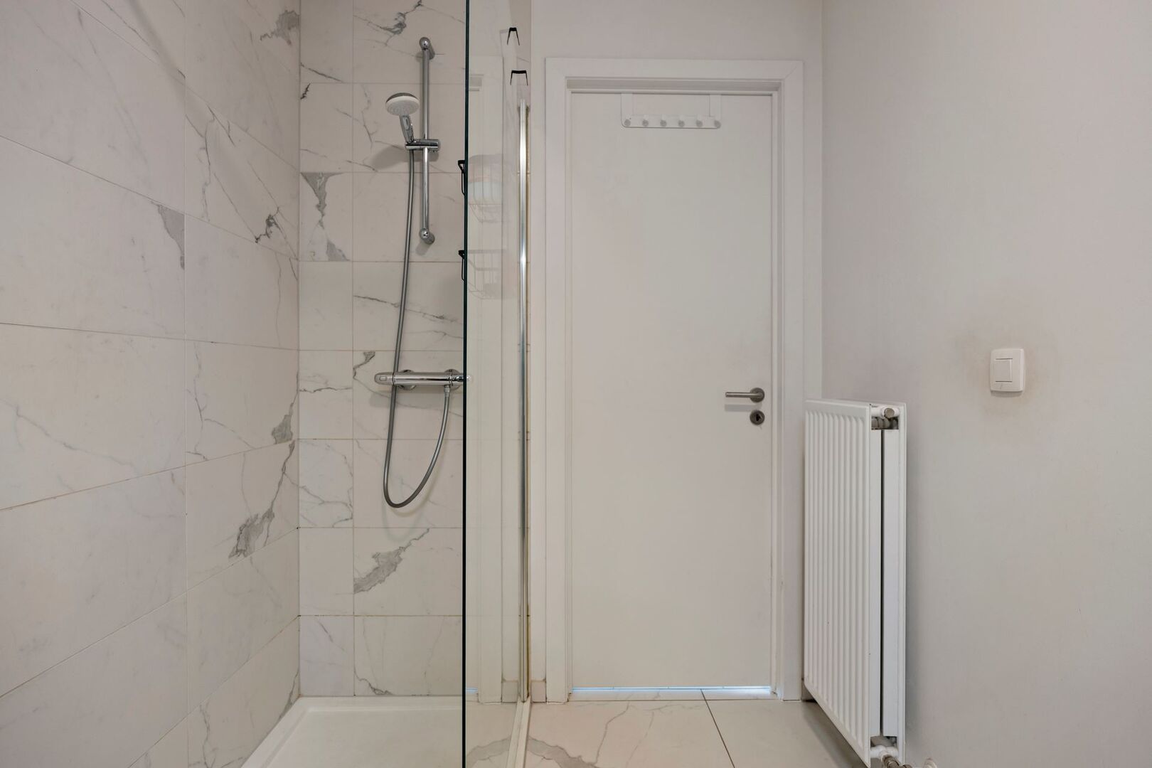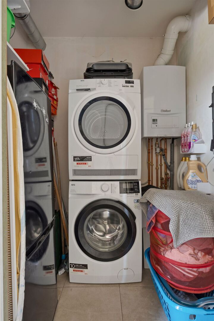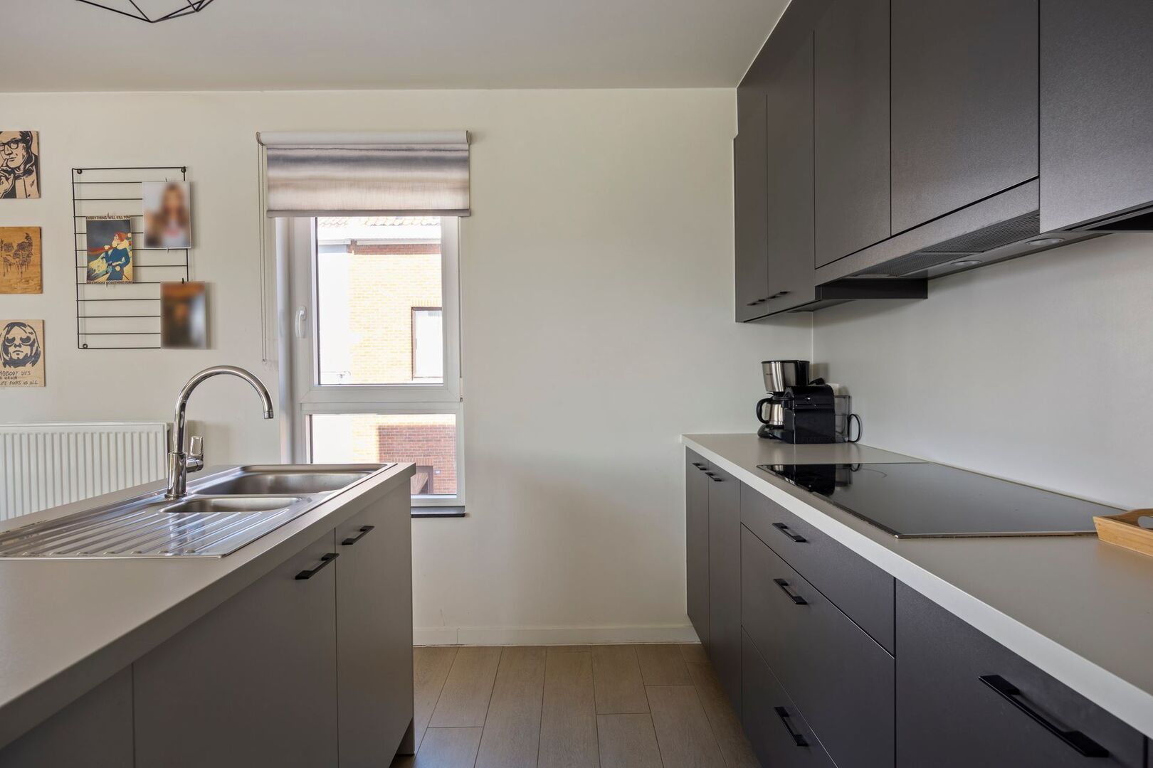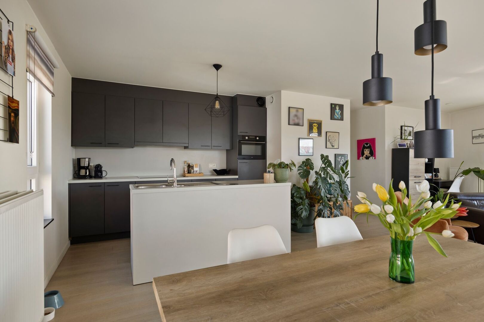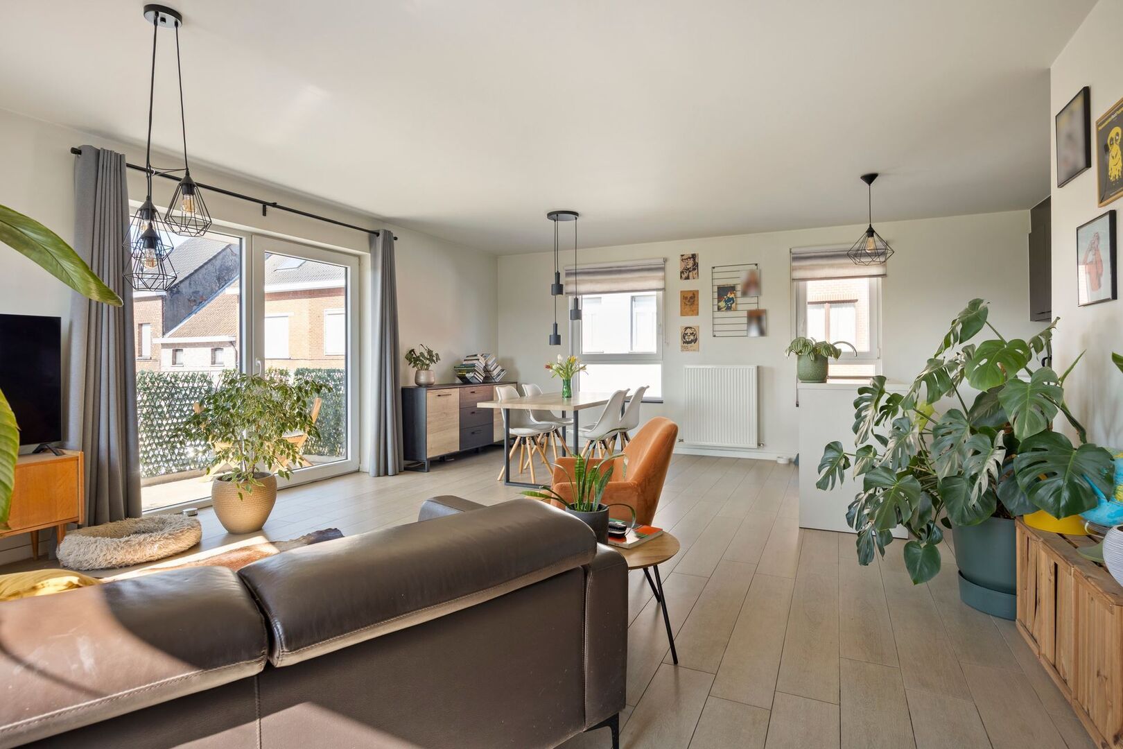 Indeling: Inkomhal / WC / ruime, lichtrijke leefruimte met eetplaats en salon (41 m²) - open, prima uitgeruste keuken met indicutiekookplaat, combi-oven, vaatwasser, ... / moderne badkamer met inloopdouche en dubbele wastafel / 2 slaapkamers (3,5 x 3,3m; 3,45m x 2,85m) / bergruimte