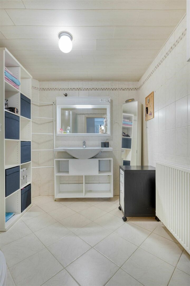 Inkomhal met vestiaire / wc met handwas / aangename living met eetplaats en salon met zicht op tuin en prima uitgeruste, open keuken met gasvuur en vaatwasser (41m²) / berging - wasplaats / ruime slaapkamer (4,6 x 4m) met inbouwkast / badkamer met wastafel en douche.