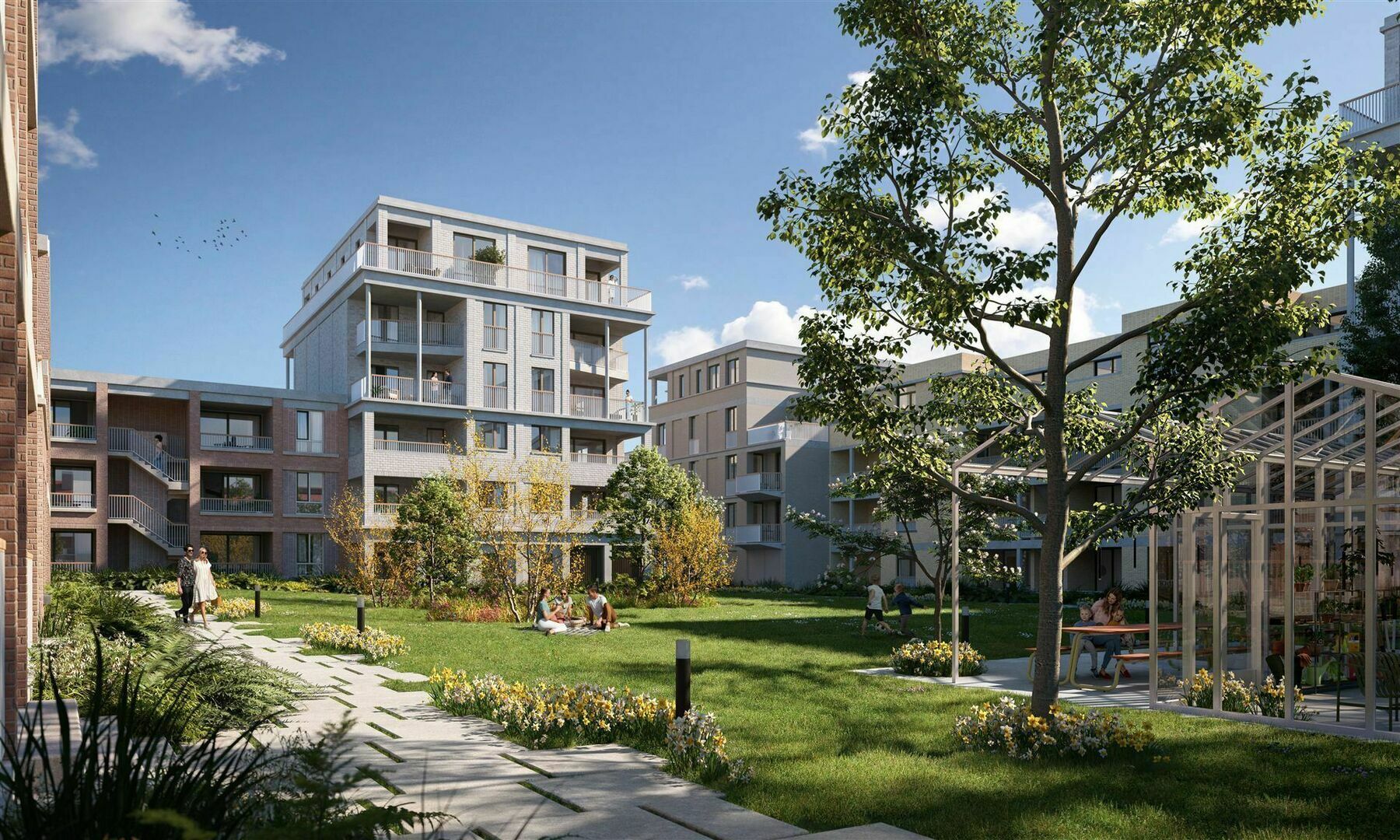 De collectieve binnentuin met serre ingericht als tuinpaviljoen is het centrale pronkstuk en vormt het perfecte decor voor een zomerse picknick met vrienden of babbel met je buren.