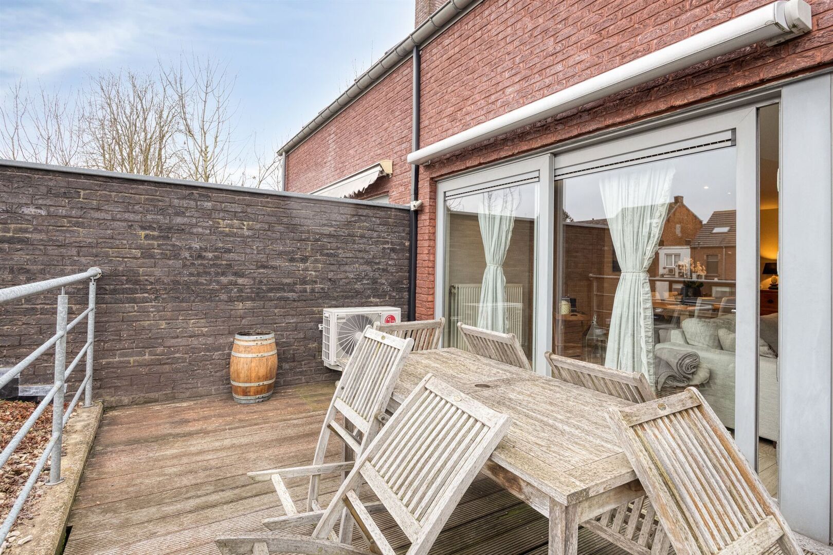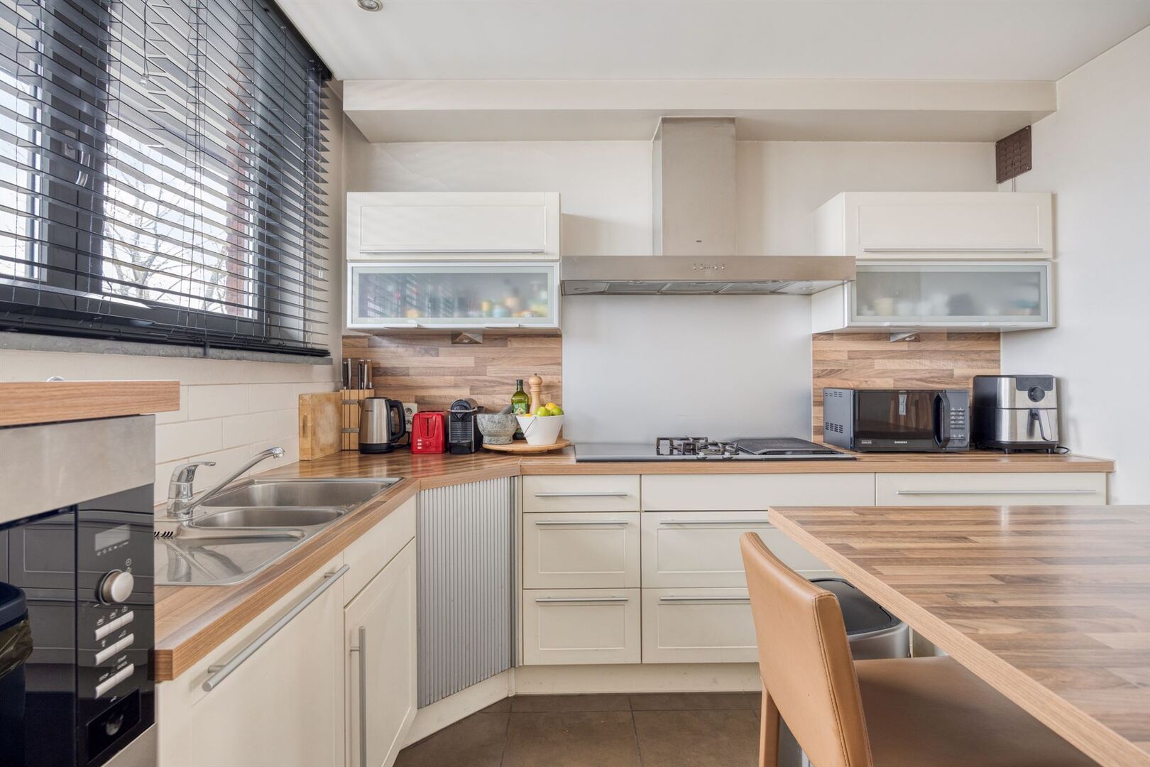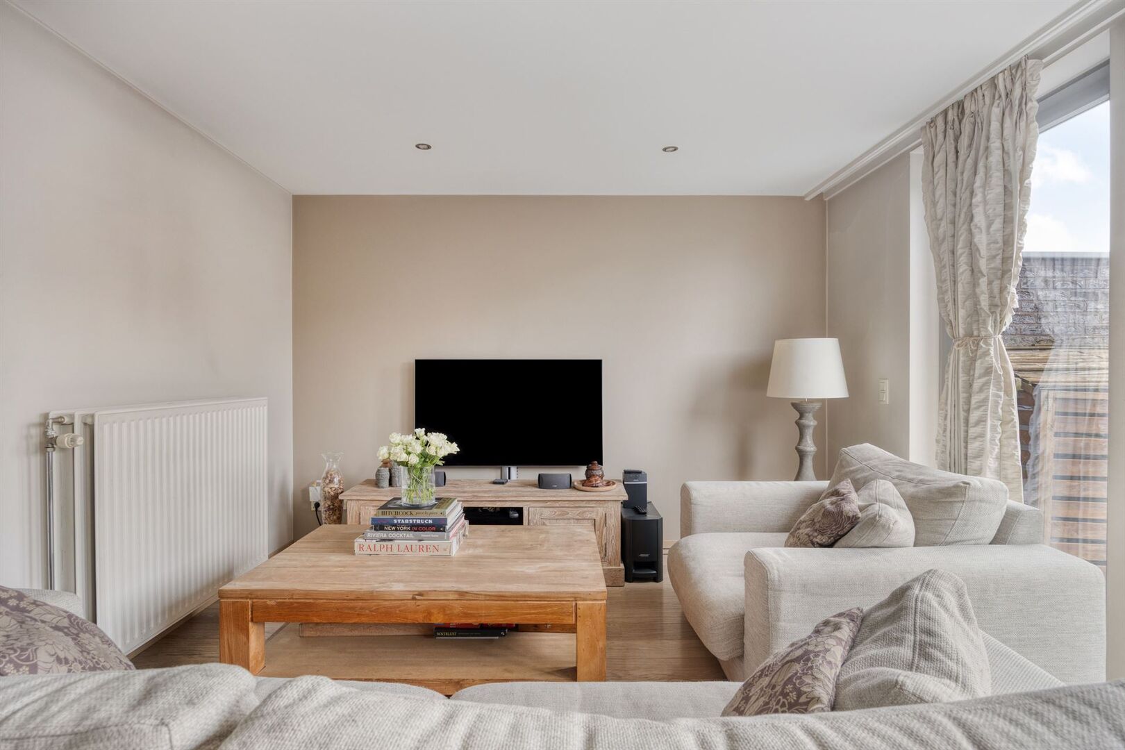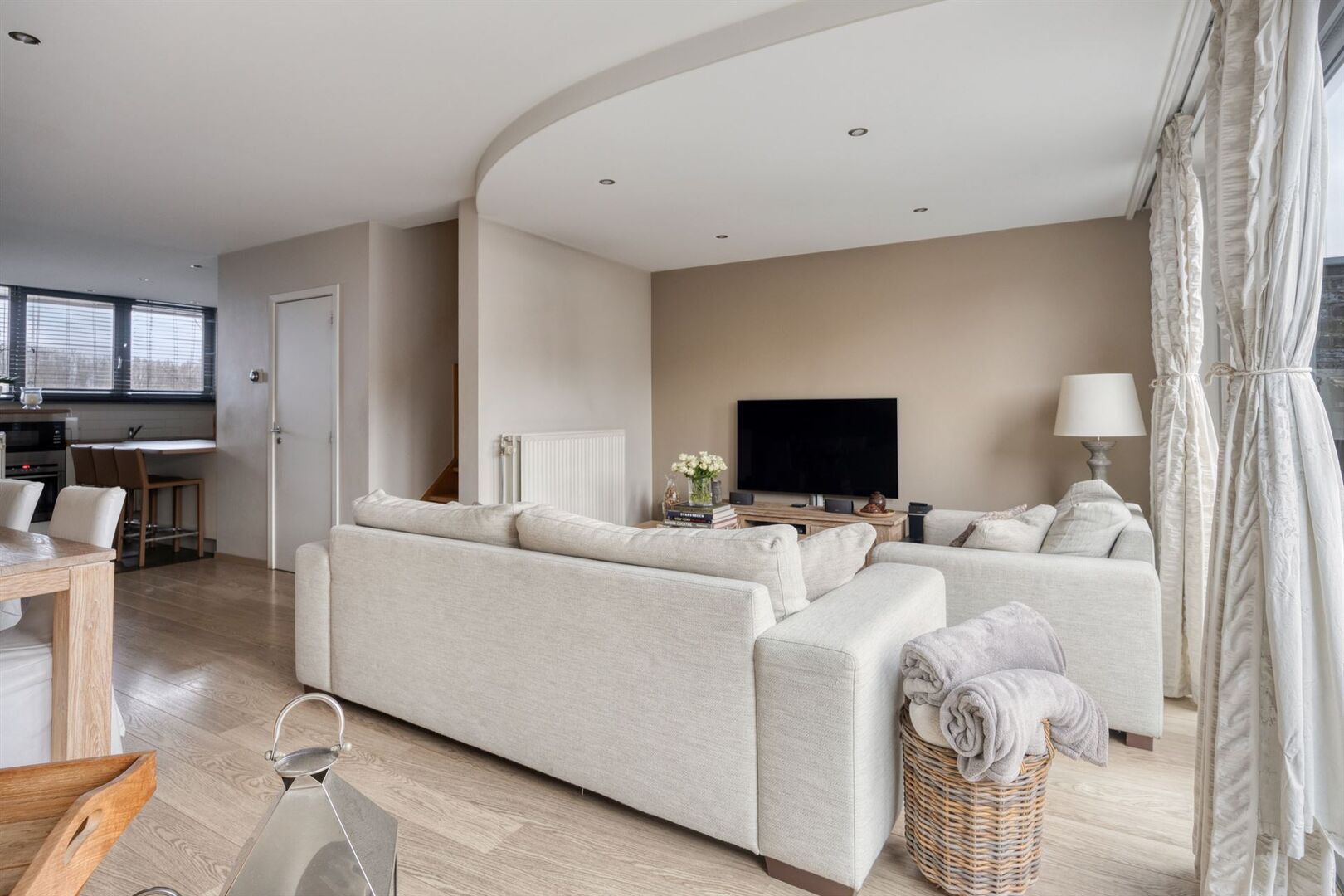 1ste verd: Inkomhal met vestiaire en wc / sfeervolle, lichtrijke leefruimte (31 m²) met toegang tot terras / goed uitgeruste keuken met gasvuur, oven, magnetron, vaatwasser, koelkast / bergruimte.