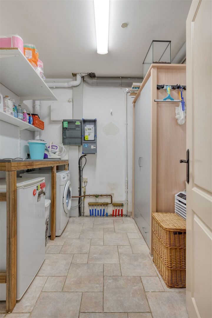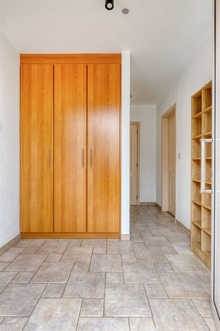 Inkomhal met vestiaire / wc met handwas / aangename living met eetplaats en salon met zicht op tuin en prima uitgeruste, open keuken met gasvuur en vaatwasser (41m²) / berging - wasplaats / ruime slaapkamer (4,6 x 4m) met inbouwkast / badkamer met wastafel en douche.