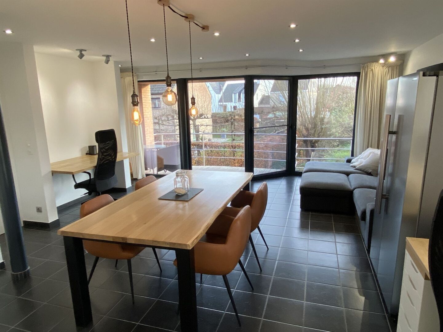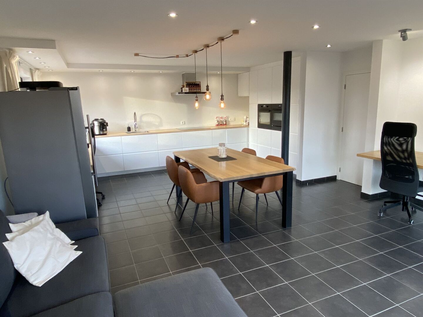 1ste verdieping: Traphal / wc / living met eetplaats en super-ingerichte open keuken (42m²) met toegang tot zuidoost-georiënteerd terras (7m²).