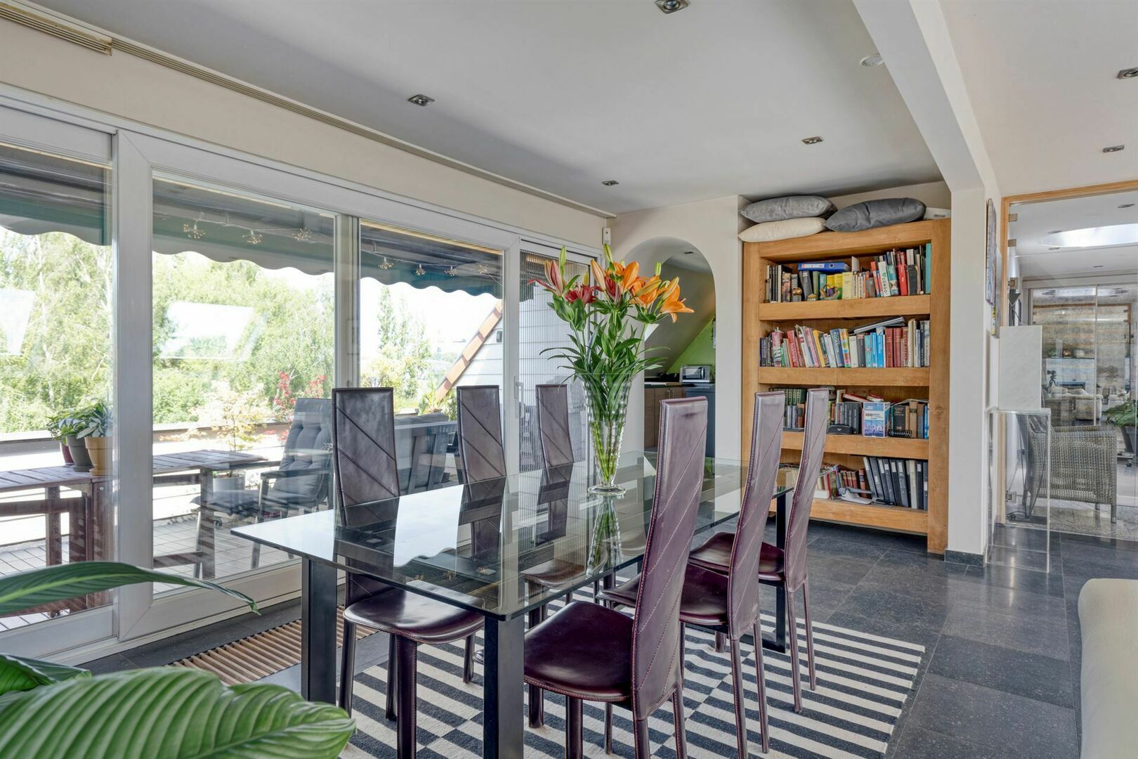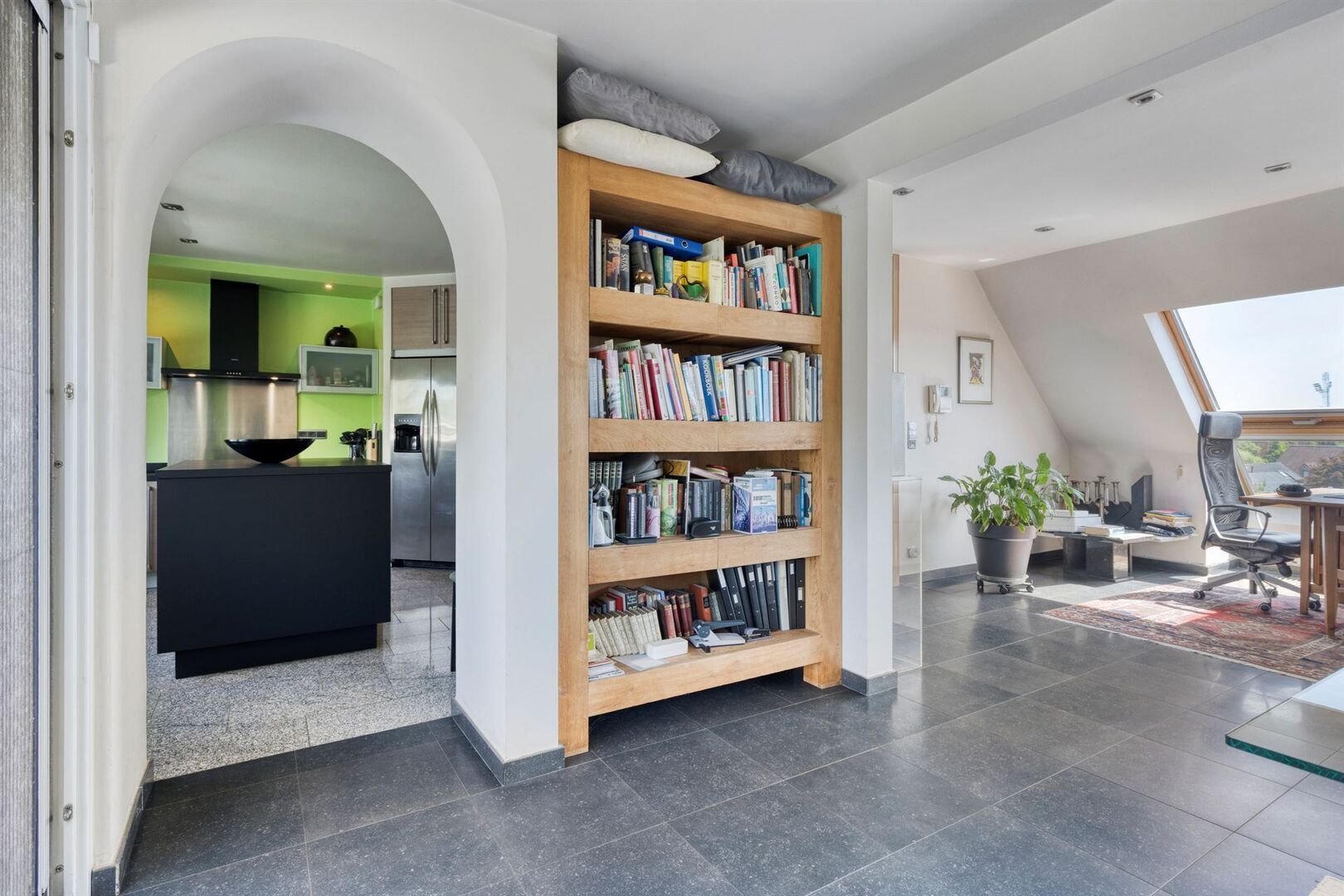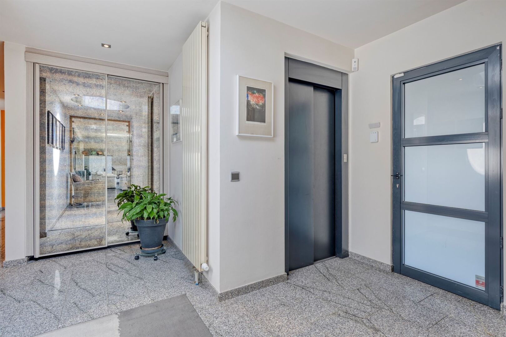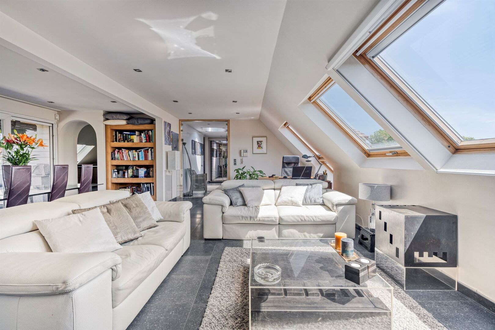 De lift van de residentie geeft rechtstreeks toegang de ruime inkomhal van het appartement. De grote raampartijen en dakvlakramen bieden bijzonder veel lichtinval.