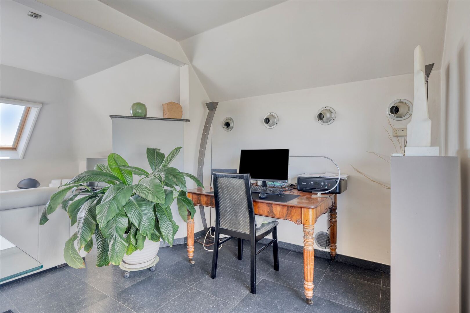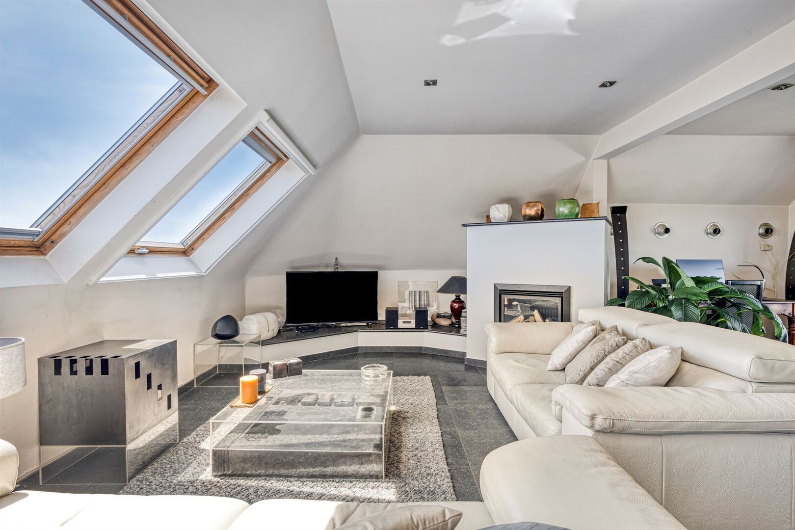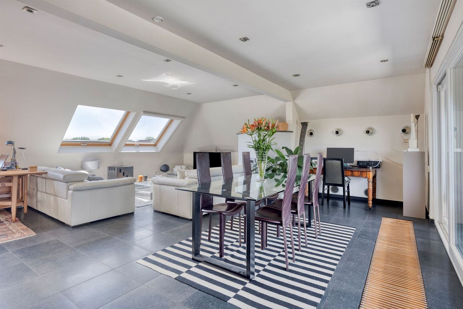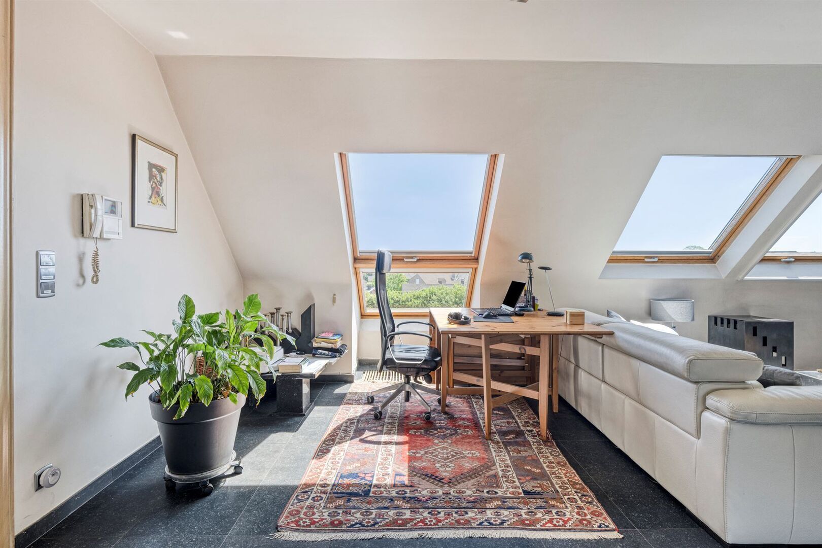 De lift van de residentie geeft rechtstreeks toegang de ruime inkomhal van het appartement. De grote raampartijen en dakvlakramen bieden bijzonder veel lichtinval.