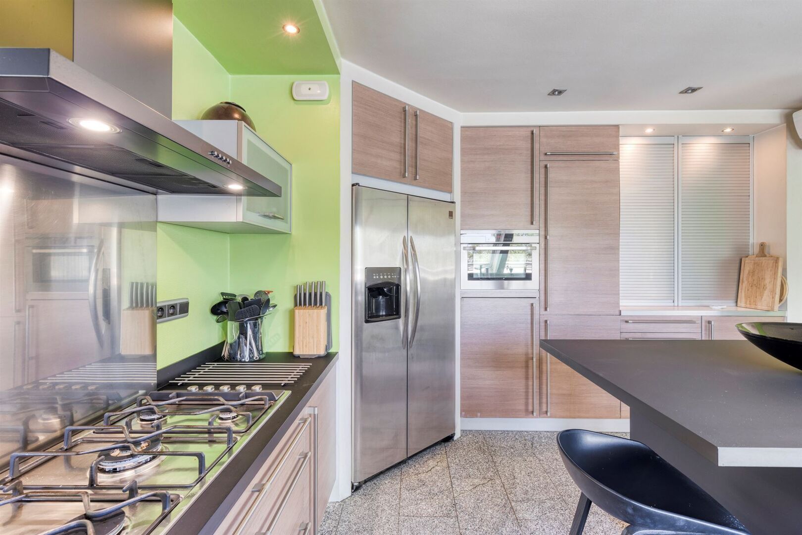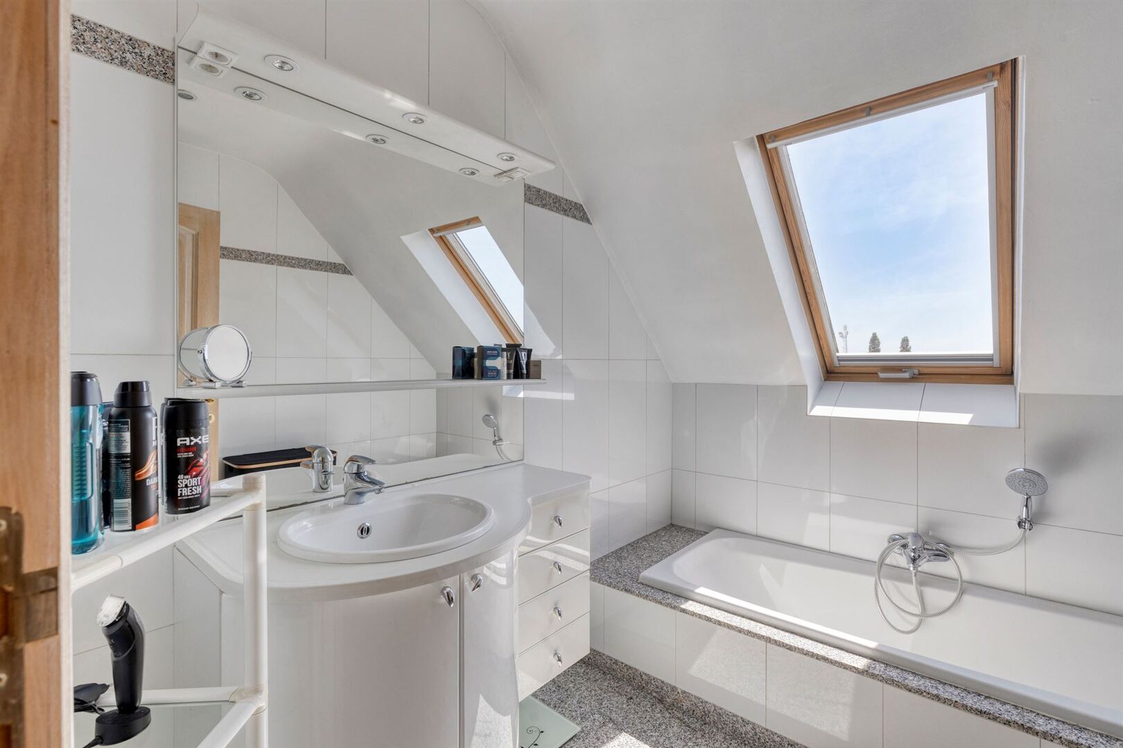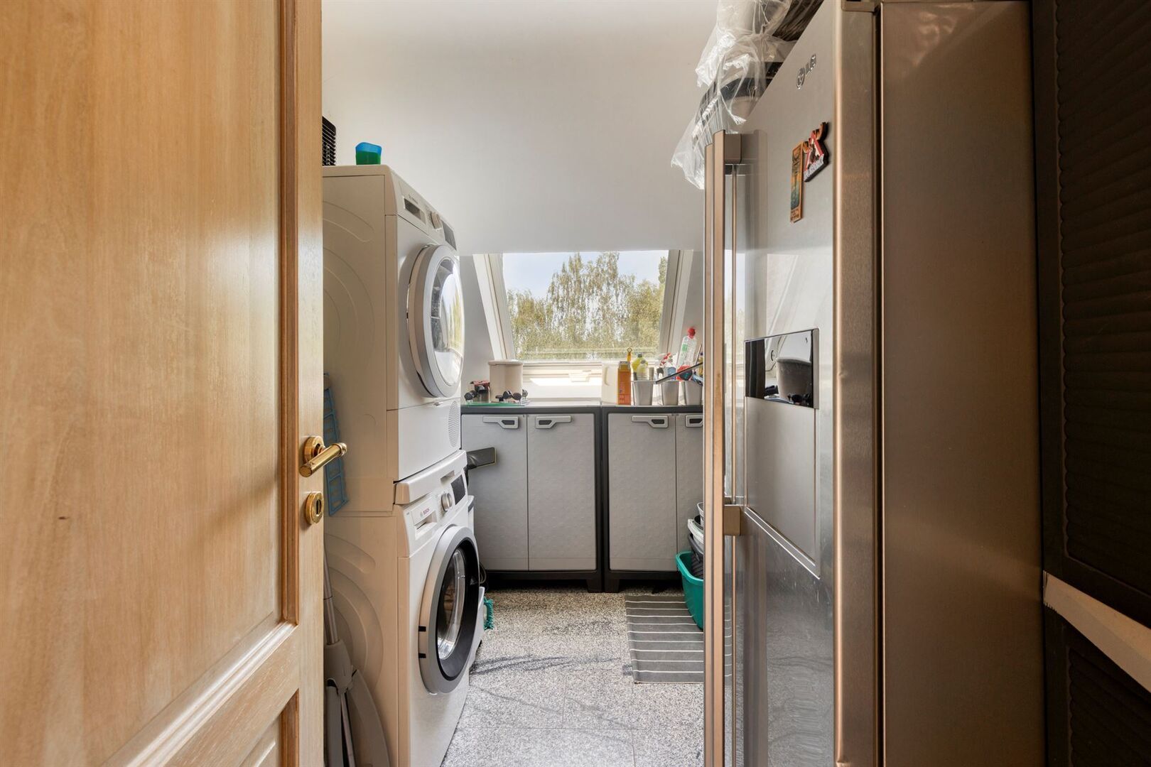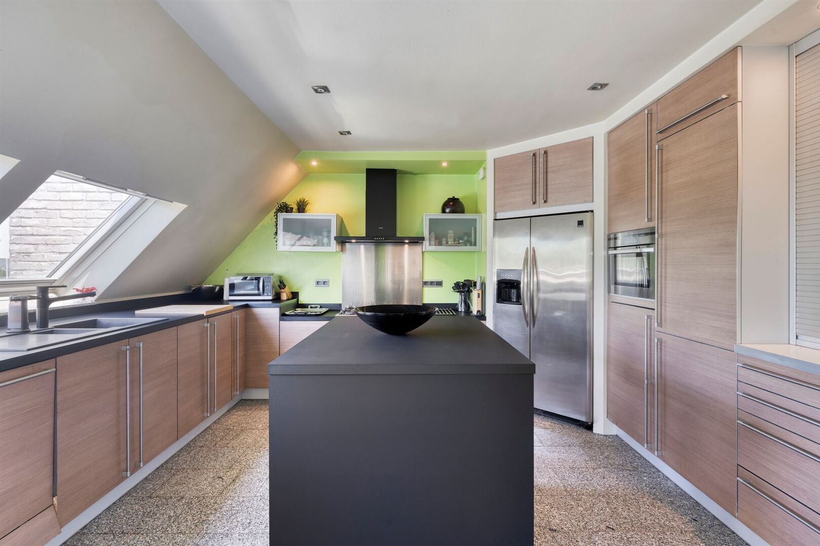 De lift van de residentie geeft rechtstreeks toegang de ruime inkomhal van het appartement. De grote raampartijen en dakvlakramen bieden bijzonder veel lichtinval.
