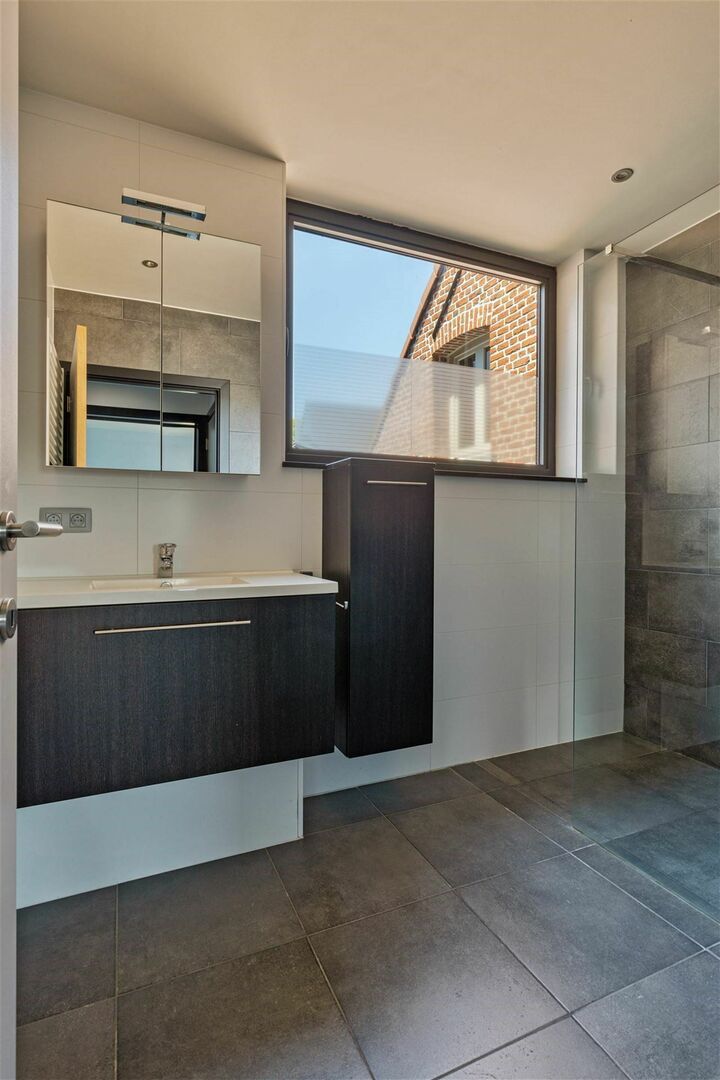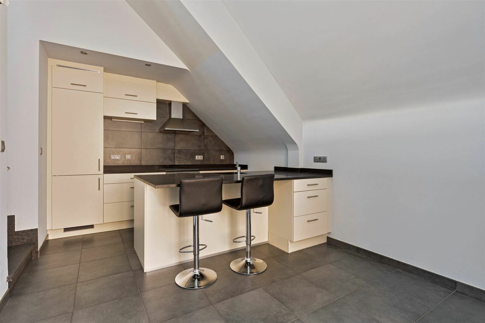 2de verdieping: Inkomhal / wc met handwas / super-ingerichte keuken met eetplaats (totale opp.: 23m²) en toegang tot terras (9m²) / 2 slaapkamers (3,2 x 2,8m; 10m²) waarvan één met toegang tot het groot terras (12m²) / badkamer met wastafel en inloopdouche.