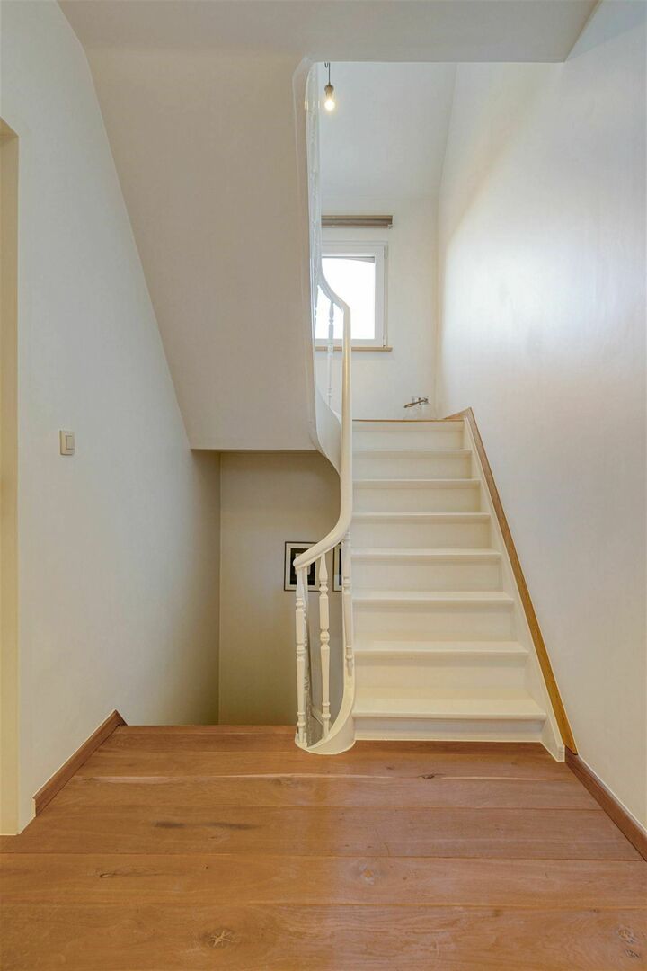 1ste verdieping: Traphal met nachthal / 2 slaapkamers (3,6 x 3,6m; 3,6 x 3,5m) / badkamer (2,5 x 1,8m) met wastafel, ligbad en wc.