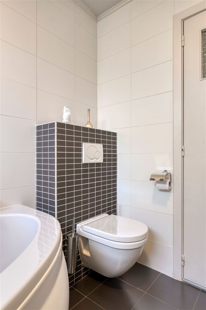 1ste verdieping: Nachthal / 3 slaapkamers (3,7 x 3,5m; 12m²; 3,5 x 2,8m) / recent vernieuwd badkamer met dubbele wastafel, ligbad met douchemogelijkheid en wc.