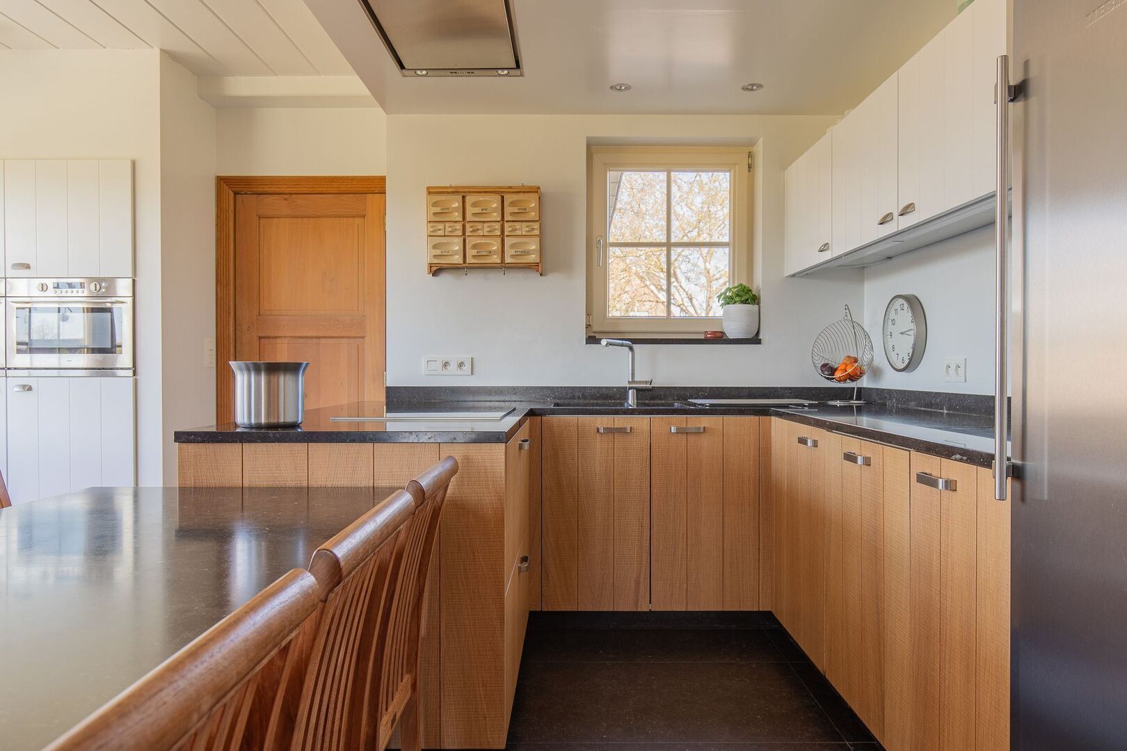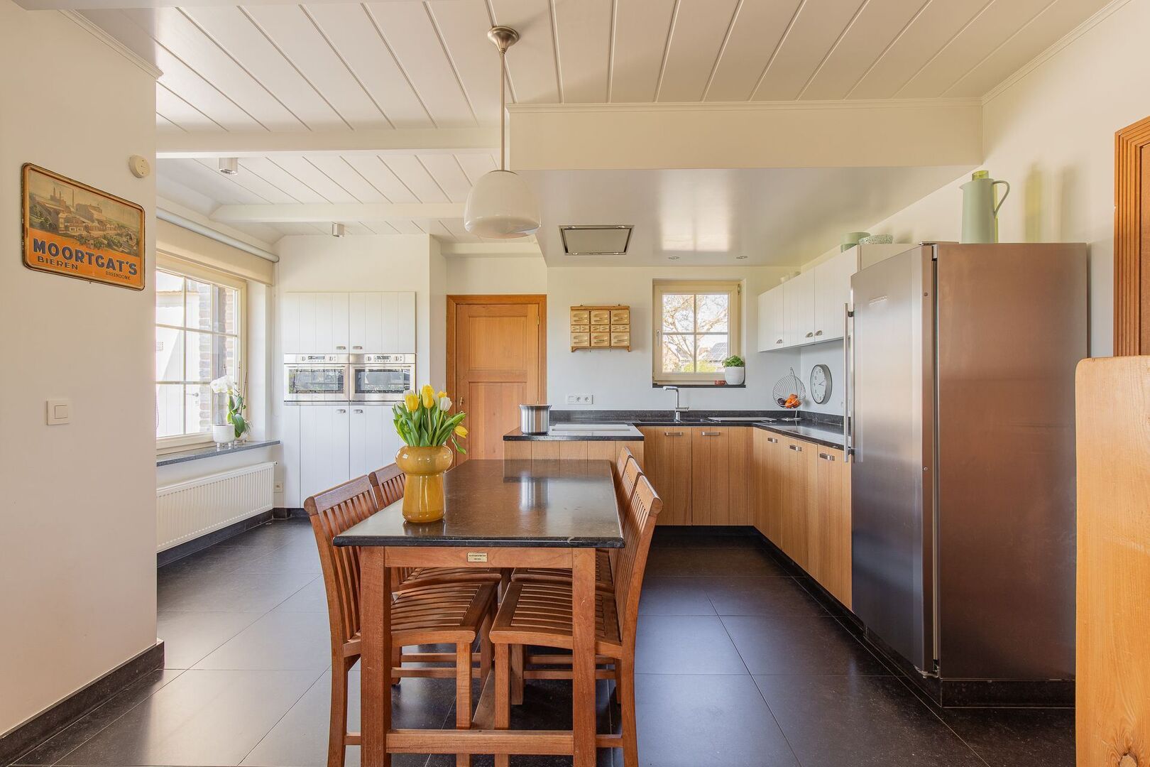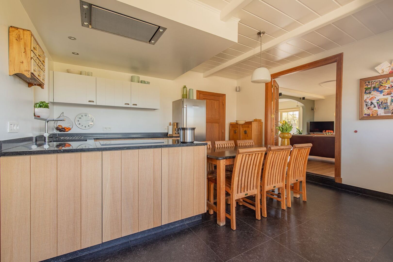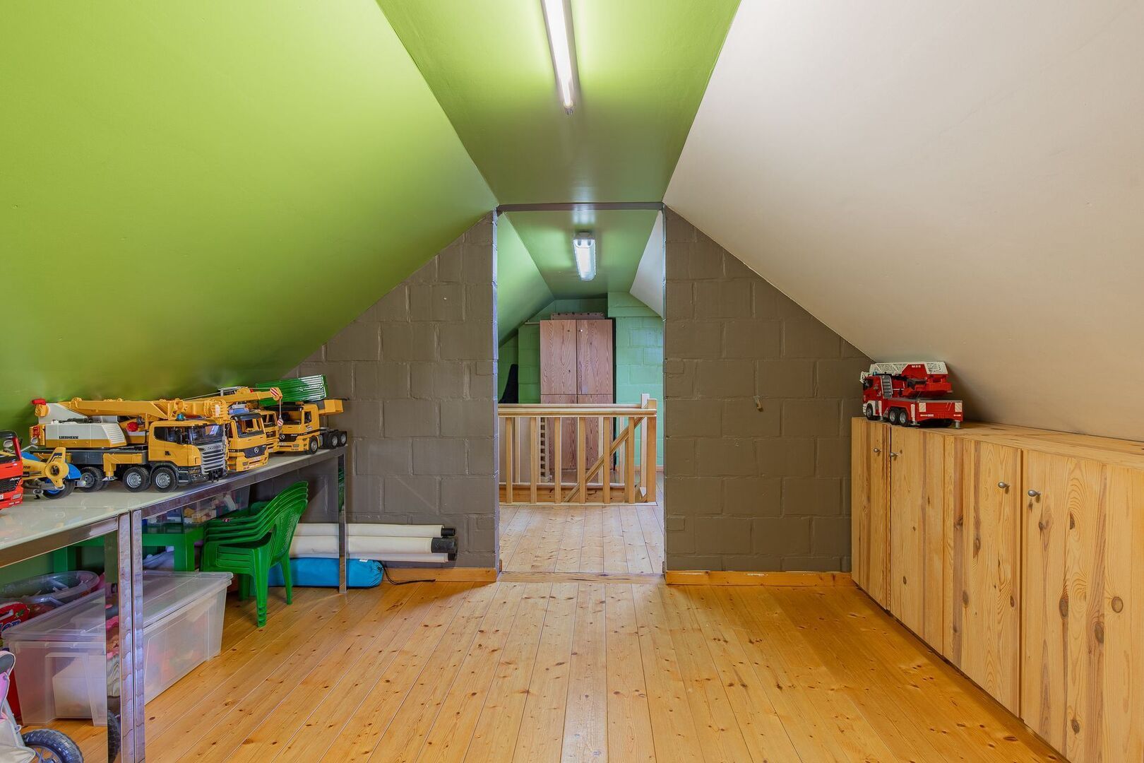 Gelijkvloers: Inkomhal / aangename, sfeervolle leefruimte met eetplaats en salon met vloerbekleding in parket, houtkachel / prima uitgeruste keuken met oven, combi-oven, inductiekookplaat en vaatwasser / aparte bureauruimte (4,1x2,12m) /ruime bergplaats - garage.