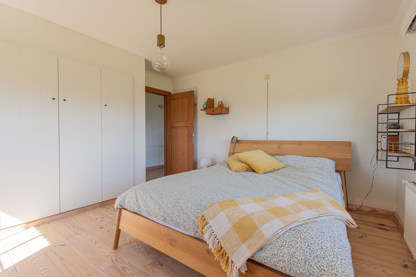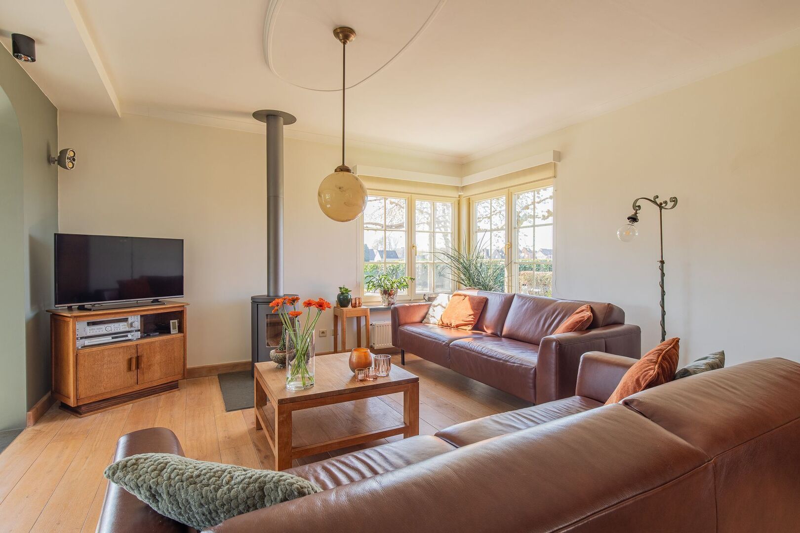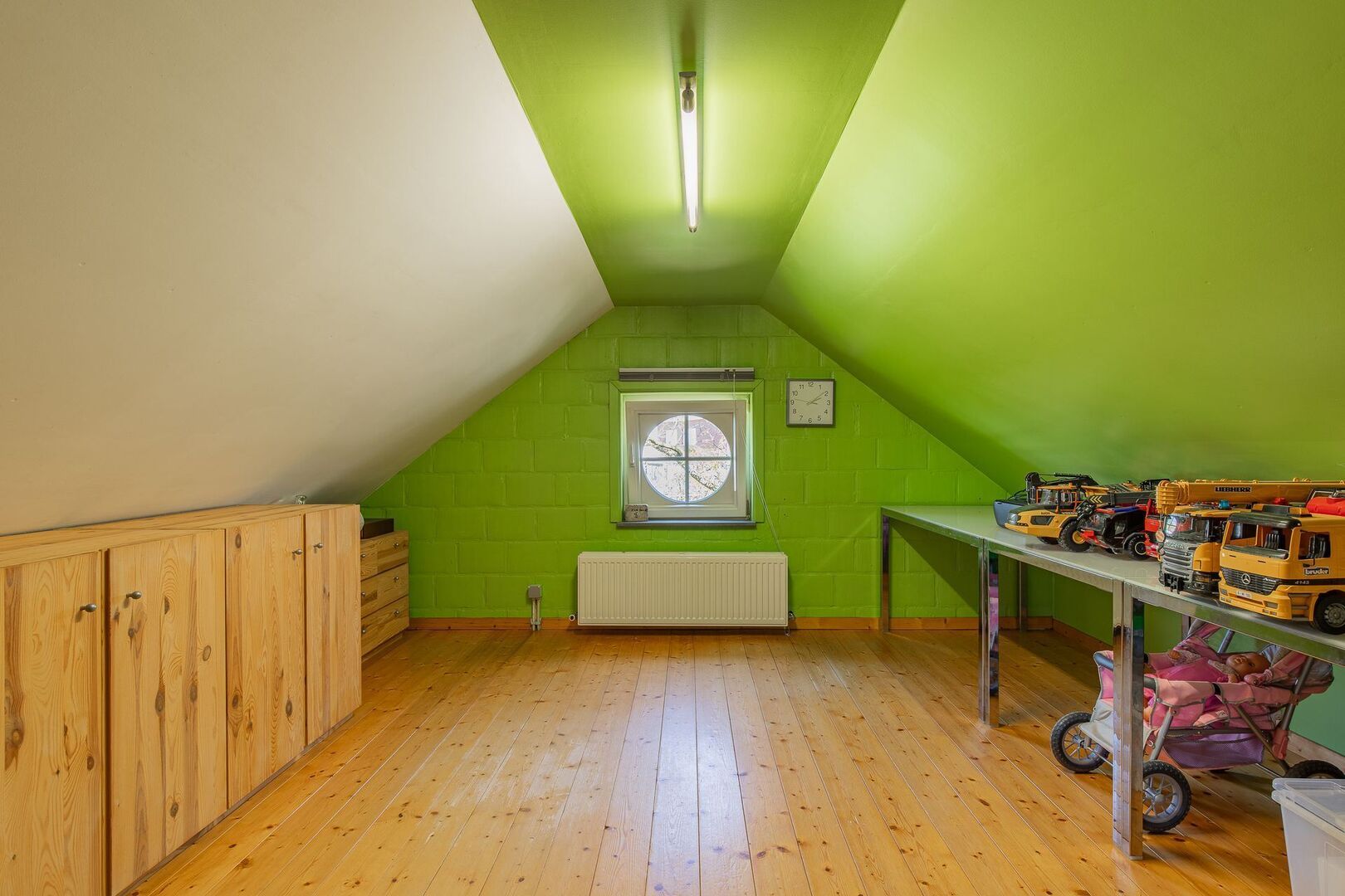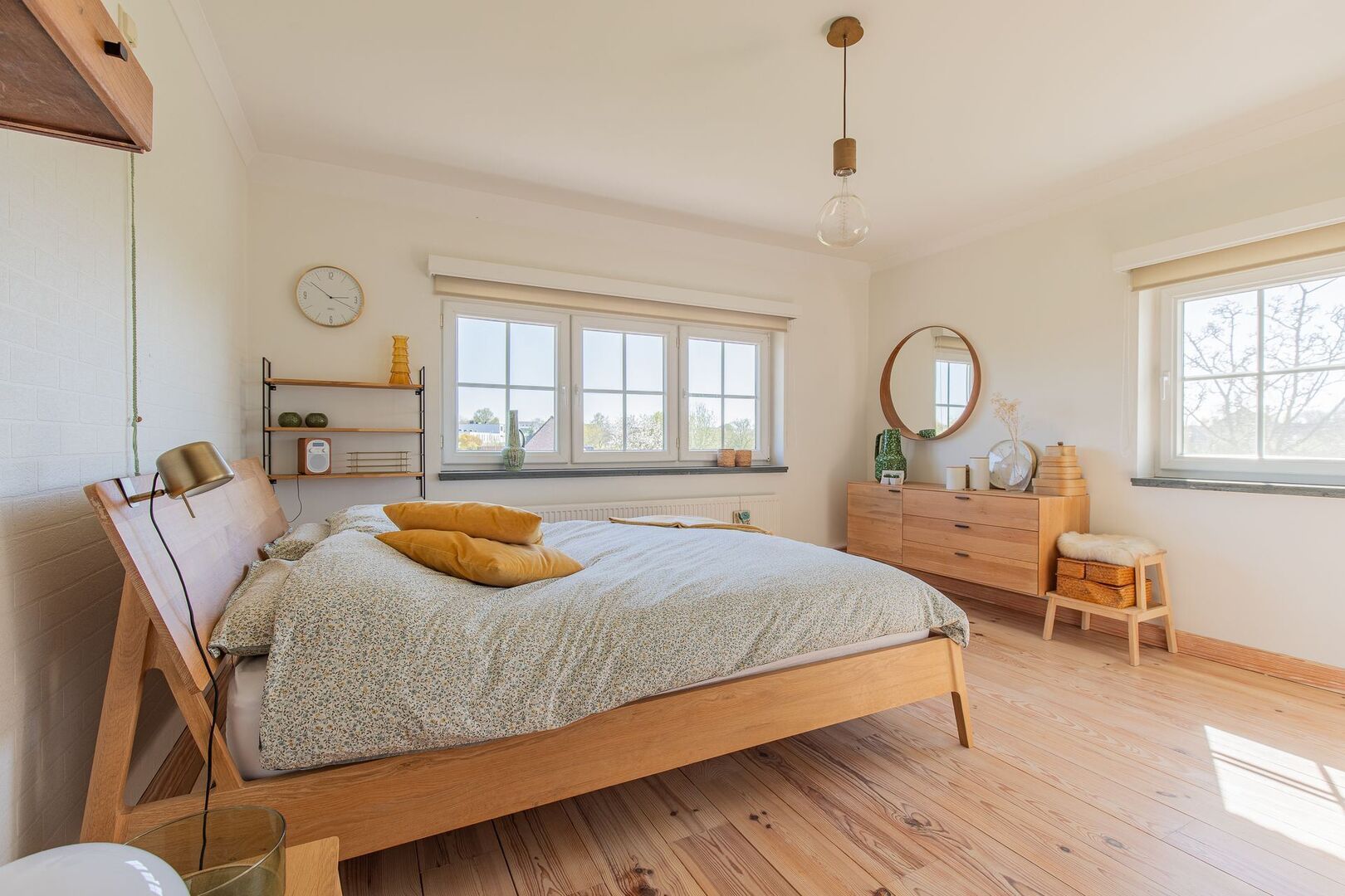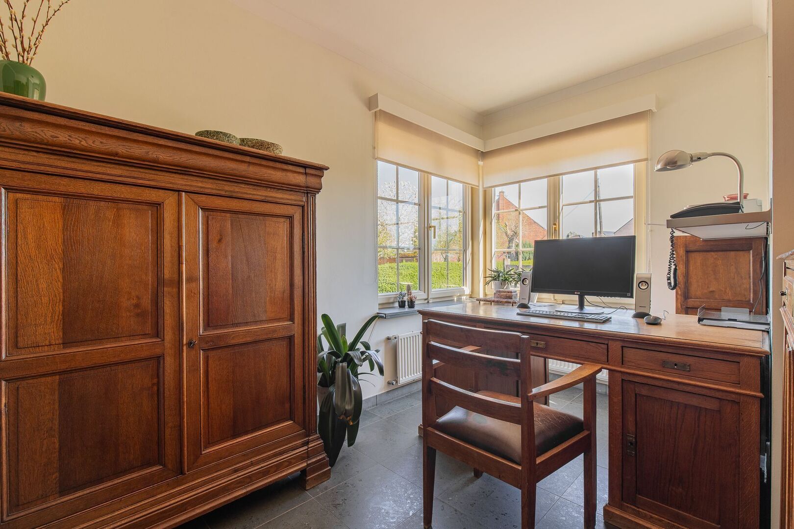 Gelijkvloers: Inkomhal / aangename, sfeervolle leefruimte met eetplaats en salon met vloerbekleding in parket, houtkachel / prima uitgeruste keuken met oven, combi-oven, inductiekookplaat en vaatwasser / aparte bureauruimte (4,1x2,12m) /ruime bergplaats - garage.