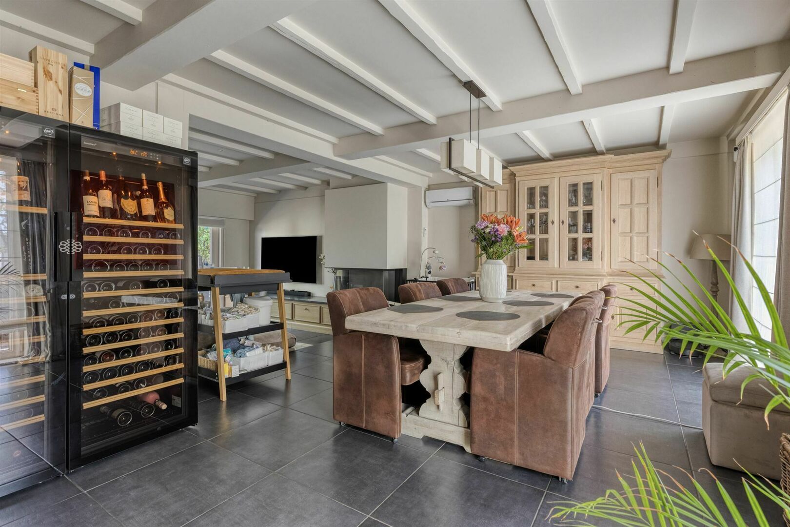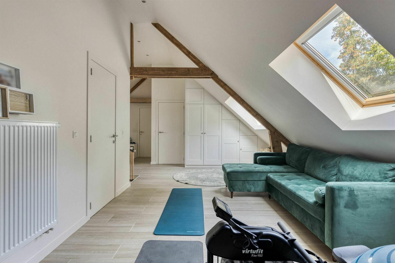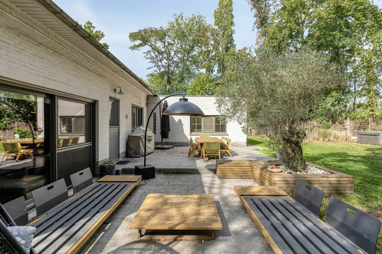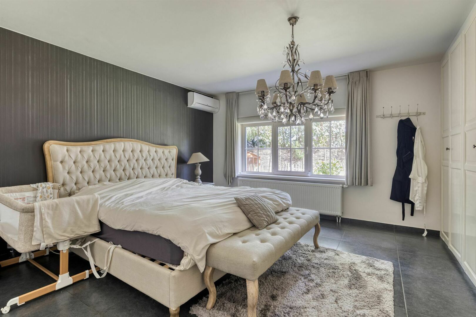 Gelijkvloers: Inkomhal / stijlvol kantoor (18m²) met prachtige inbouw wandkast / sfeervolle en ruime living met veel lichtinval uitgerust met gashaard (49m²) en airco / prima uitgeruste keuken met moderne toestellen / master bedroom met inbouwkasten (20m²) en airco /