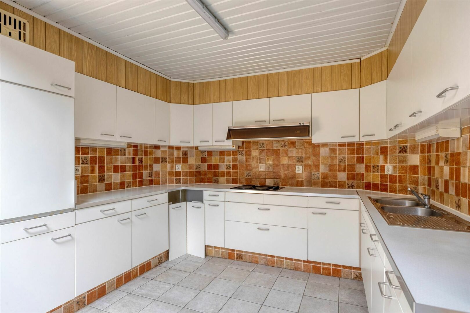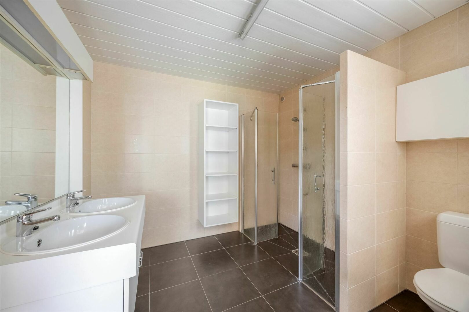 Gelijkvloers: Inkomhal / ruime living met eetplaats en salon (32 m²) / keuken voorzien van laden en kasten uitgerust met elektrisch kookvuur / badkamer met dubbele wastafel, douche en wc.