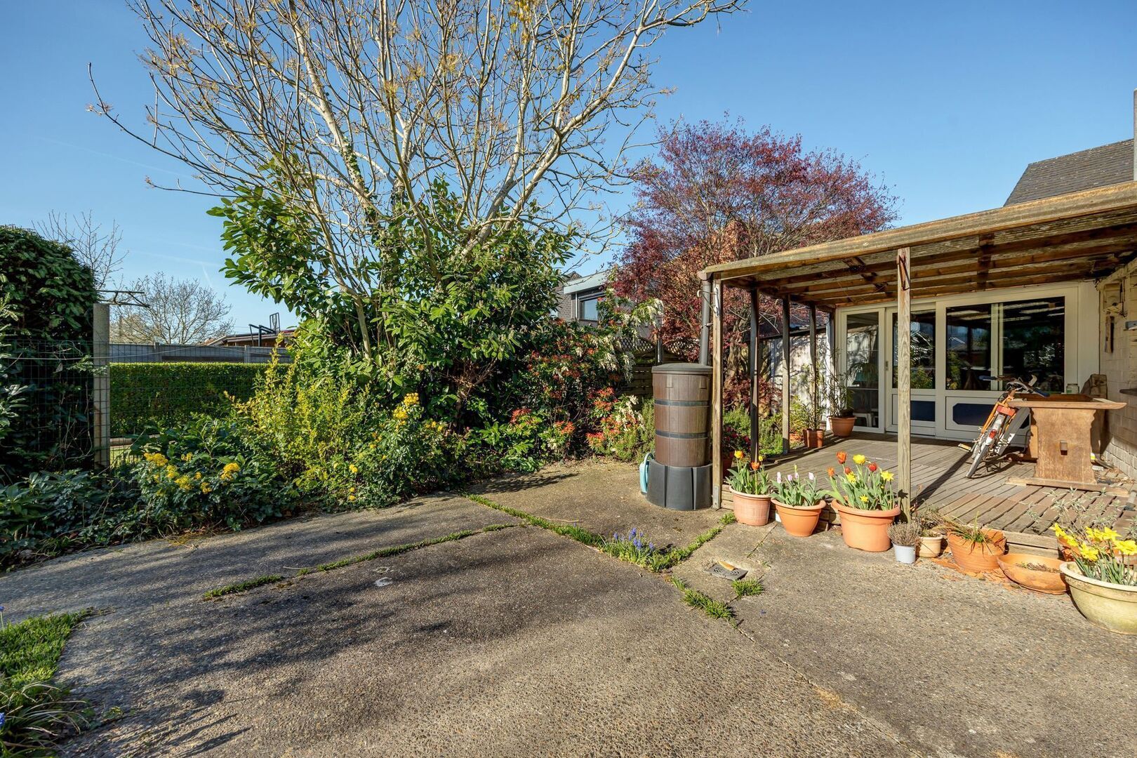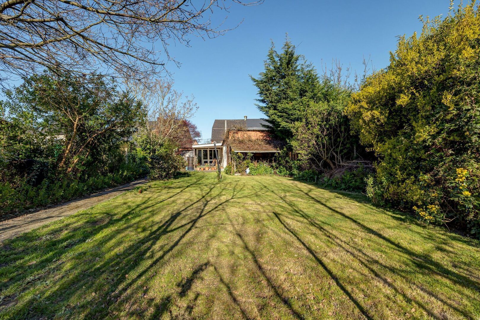 Aangename en grote tuin met zuid-oostelijke oriëntatie, waar mogelijk ook nog een grote bijkomende garage kan worden vergund (bereikbaar via achtergelegen straat Flierke)