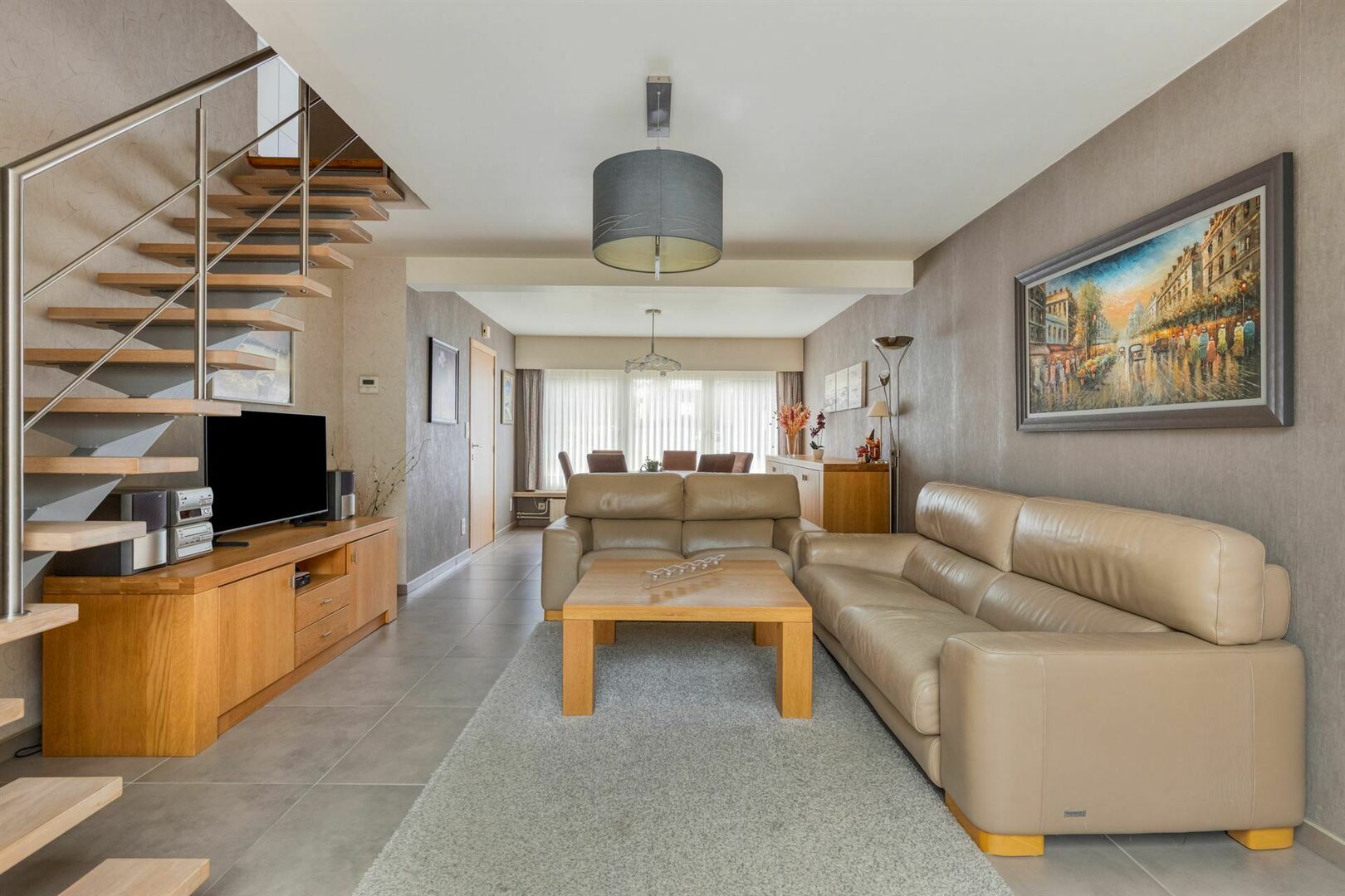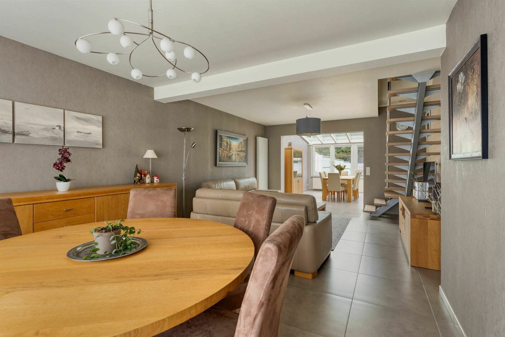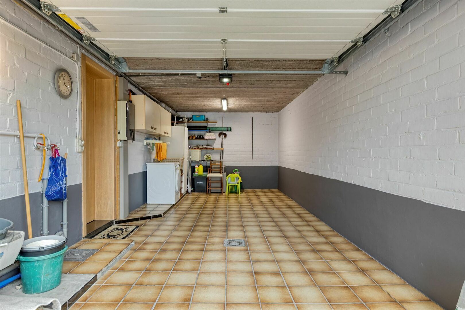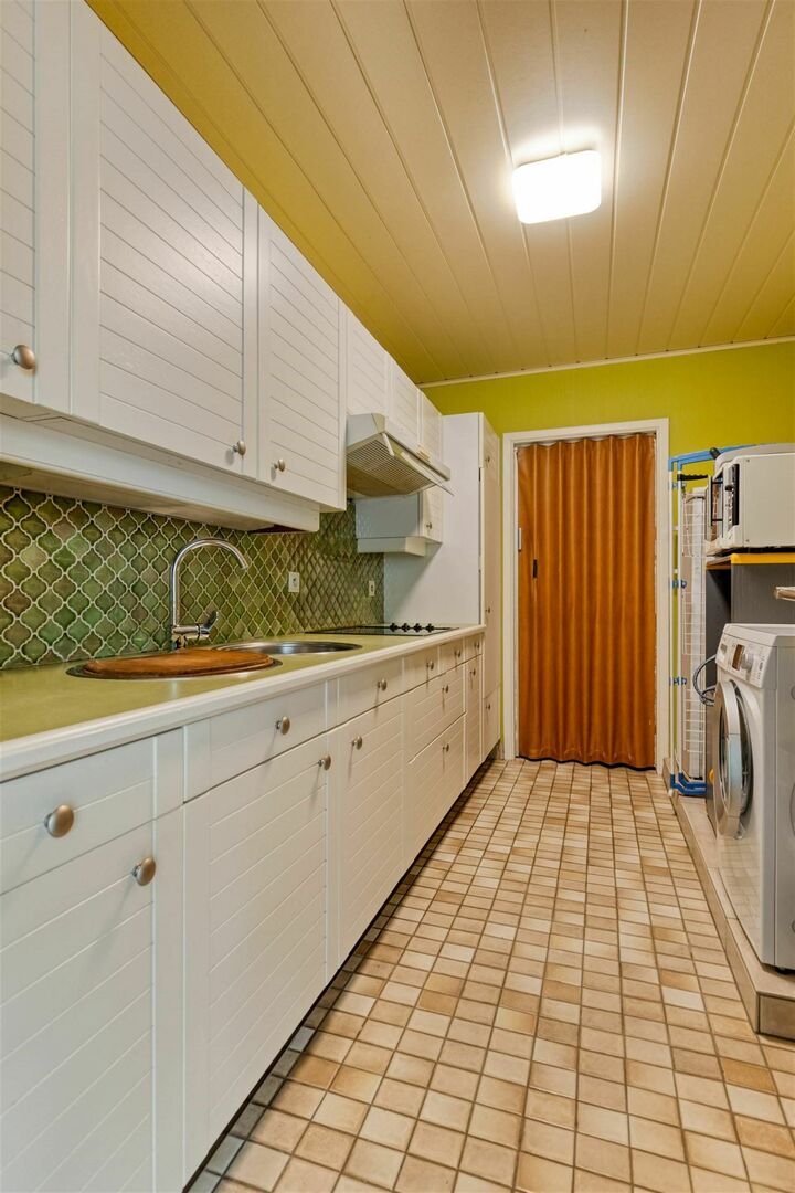 Gelijkvloers: Inkomhal / sfeervolle, ruime leefruimte met eetplaats en salon, vloerbekleding in keramische tegels / hedendaagse, goed uitgeruste keuken met met inductiekookplaat, vaatwasser, oven, ... en eethoek / handige bijkeuken - bergplaats (4,6 x 2,2m) / ruime garage.