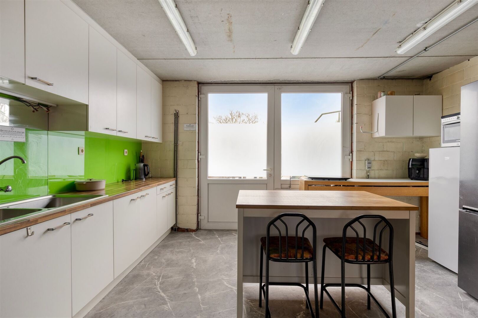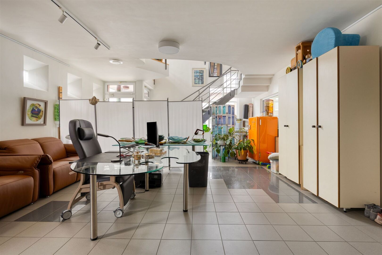 Gelijkvloers: Showroom – atelier – polyvalente ruimte (9 x 5,7m) / atelier-slaapkamer (8 x 6m) / keuken (4,5 x 3,4m) / berging met wasplaats (2,2 x 2,1m) / wc met handwas / Badkamer (2,4 x 2,3m) met wastafel,