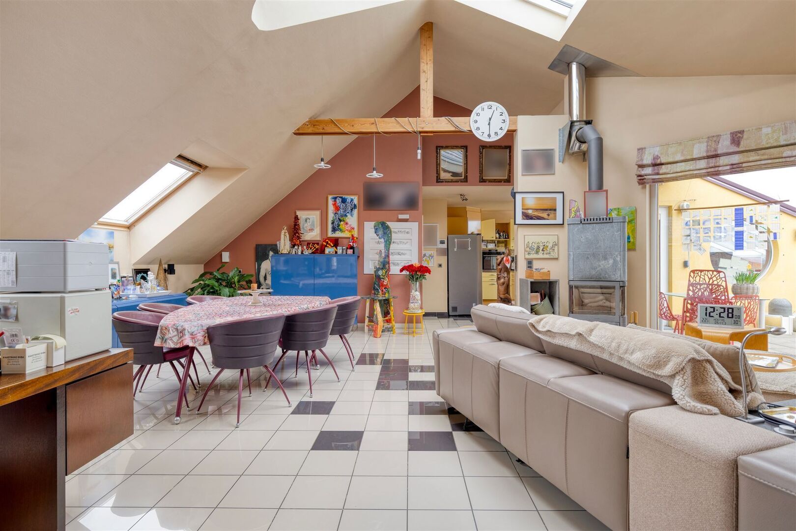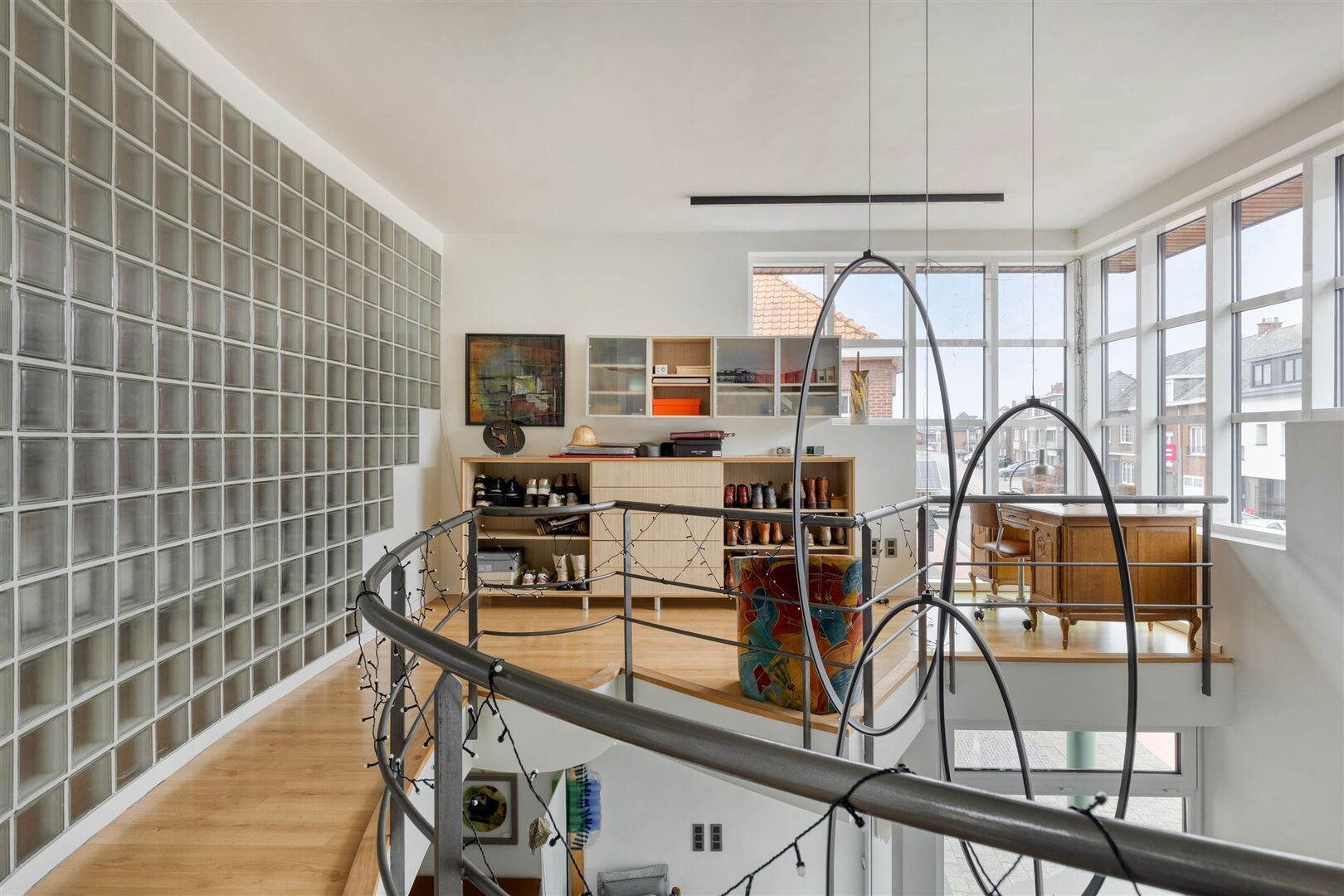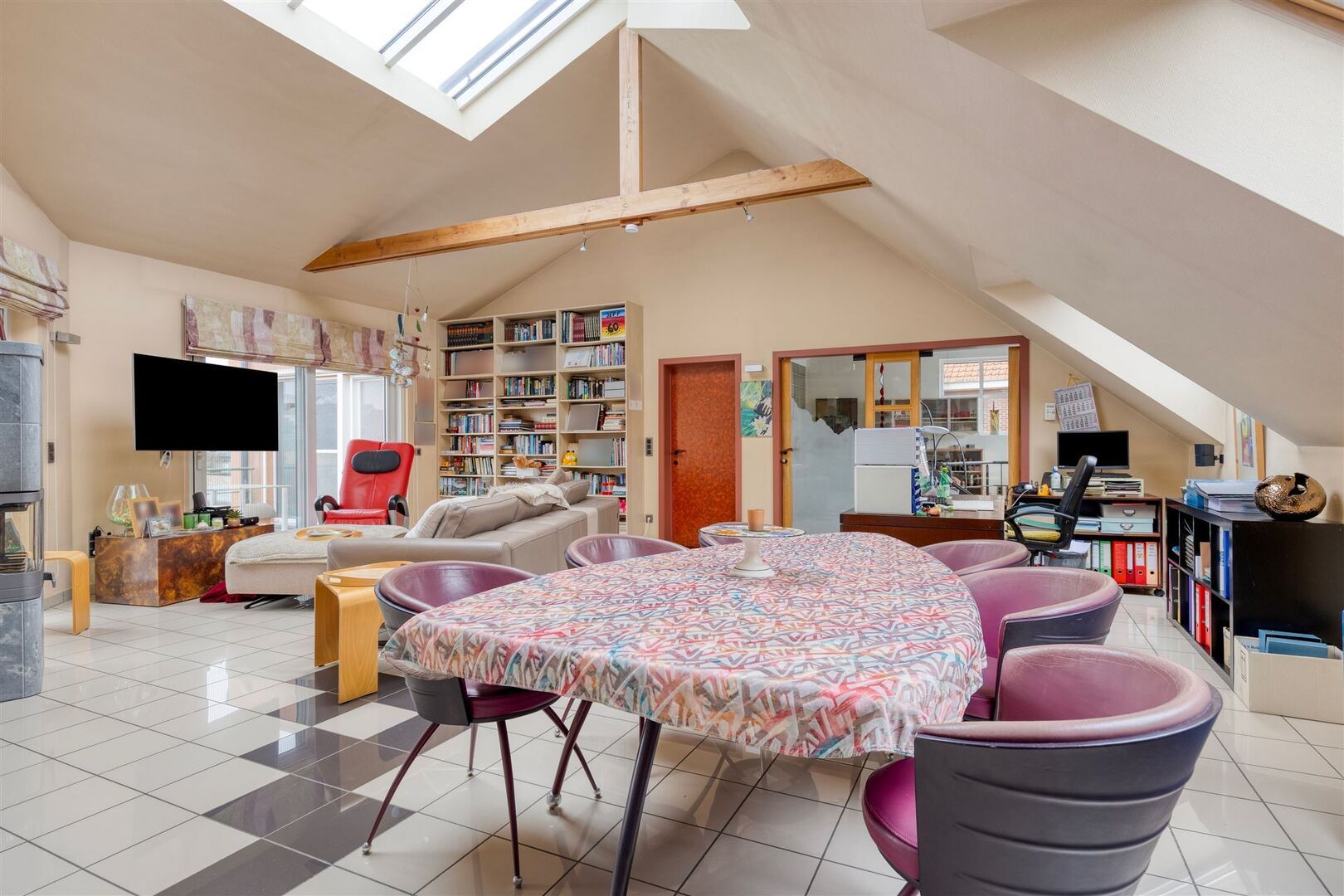 1ste verdieping: Grote traphal met vide en bureau / living (62m²) (tot in de nok) met toegang tot zuid-georiënteerd terras (36m²) / super-ingerichte keuken (7,3 x 3,5m) / nachthal met inmaakkasten / wc met handwas / 3 slaapkamers (5,6 x 5m (met dressing); 7,9 x 3,5m (met mezzanine (3,6 x 2,7m) en wastafel); 21m²) / badkamer (18m²) (grenzend aan hoofdslaapkamer) voorzien van wastafel, ligbad met massagefunctie, douche en wc / badkamer - wasplaats met douche (zonder wastafel) (toegang vanuit nachthal).