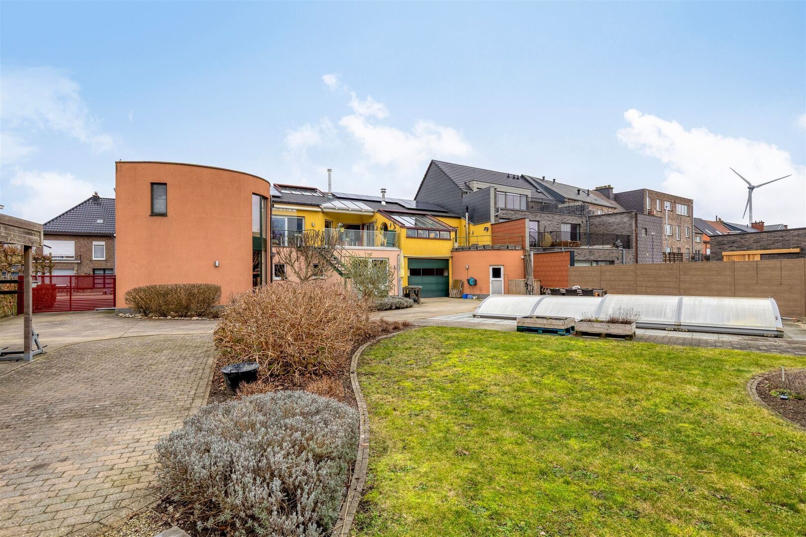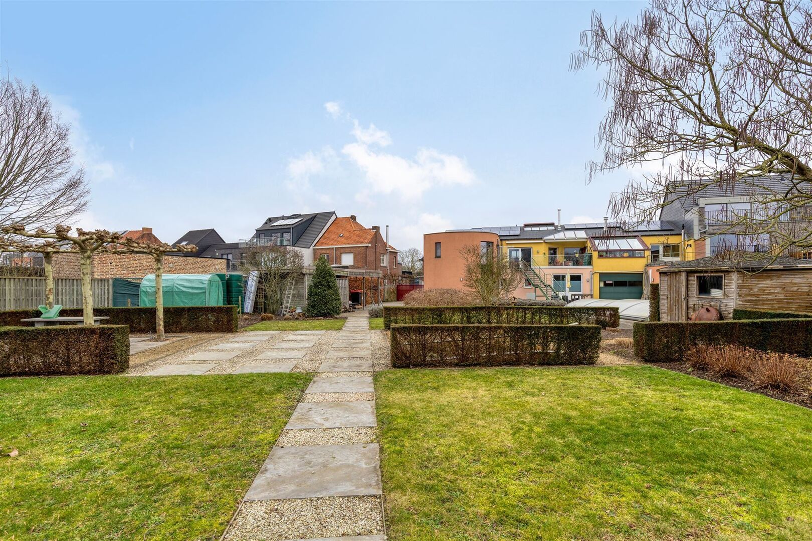 Mooi aangelegde tuin met veel privacy voorzien van terrassen, zwembad en tuinberging (tevens bereikbaar via uitweg achteraan perceel).
